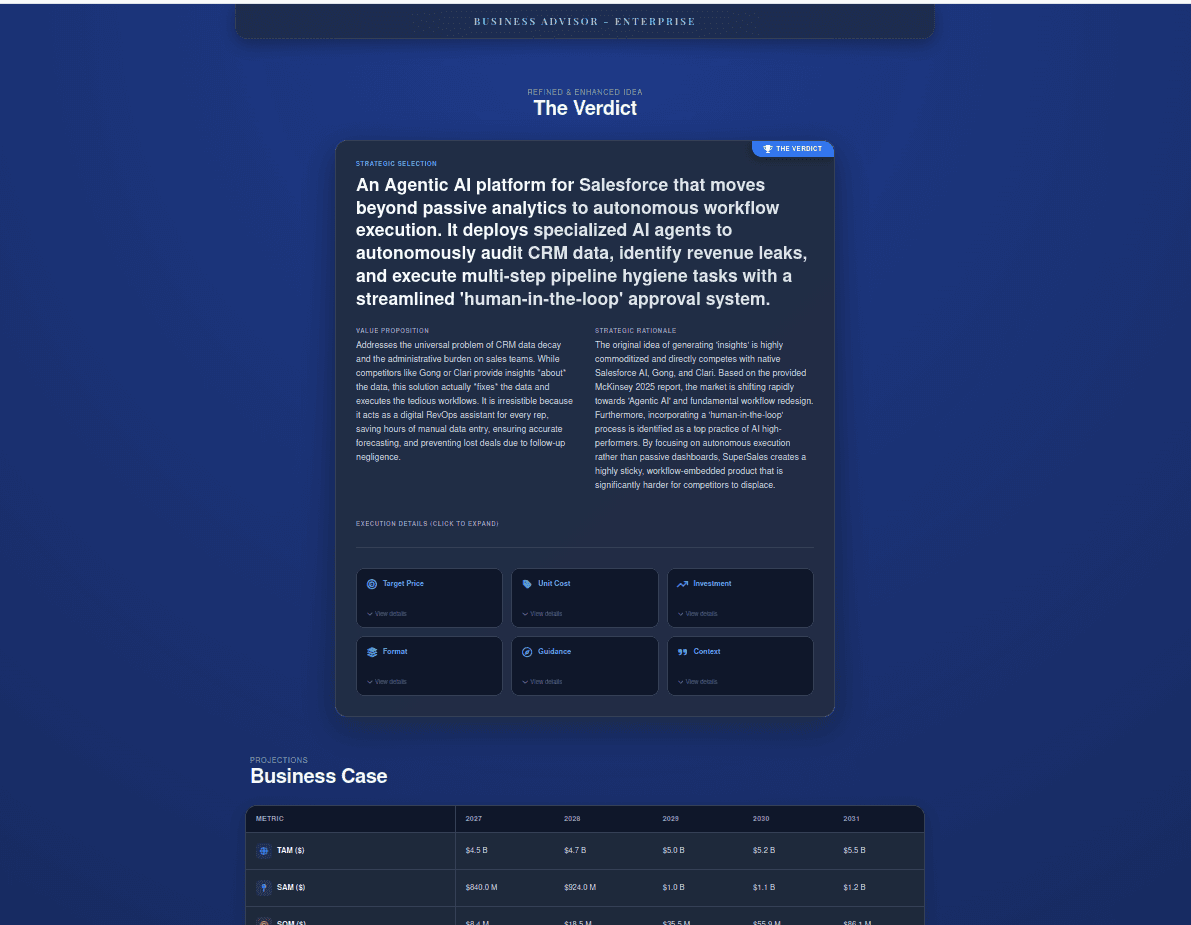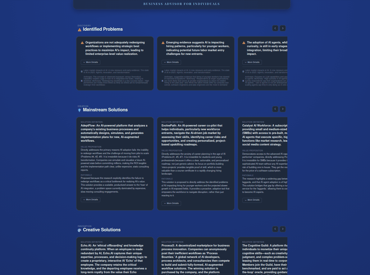 Inspired on the amazing book "What is your dream?" from Simon Squibb, this agent combines your passions, hobbies and experience to find you relevant problems to solve, give you proposals of ideas, provide a market evaluation and a 30, 60 and 90 day plan to getting started!